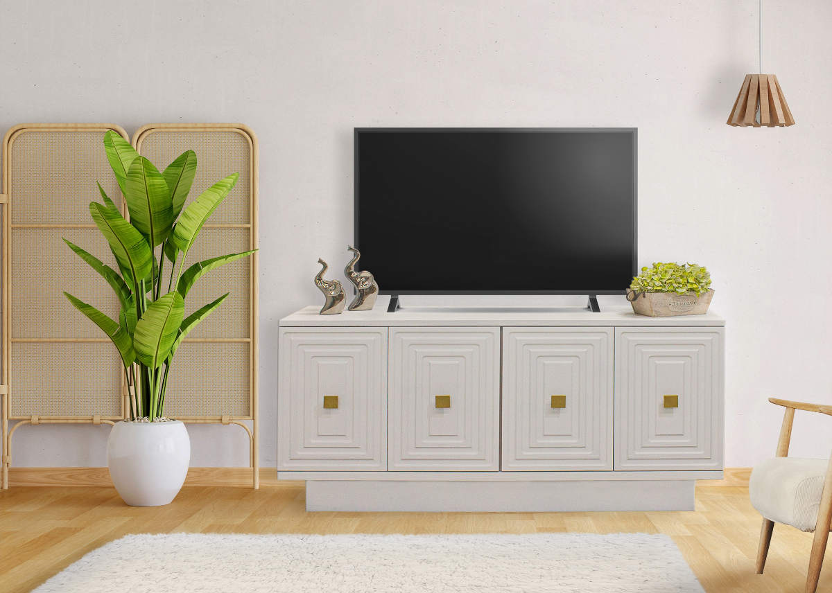 The 81" Palmer TV stand showcases a modern design, crafted from solid pine wood and finished with white acrylic paint. The doors are accented with clean lines and brass-colored metal handles for a touch of elegance. The back panel includes interconnection pass-through slots for efficient cable management. Designed for your media organization, it offers four doors with a built-in shelf to neatly store your media out of sight.Read More
