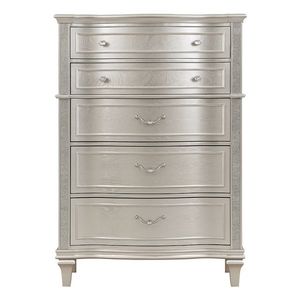 Elevate your guest room or main bedroom with this breathtaking glam Auderi Chest. The space-saving tall design boasts a curvy front facade, seen throughout the wavy trim appointed drawer panels. Five spacious drawers offer ample space for all your bedroom necessities, along with a soft grey felt-lined top drawer for more delicate items. A silver finish covers the entire chest frame as slender glittering side panels lend a luxe modern flair.Read More