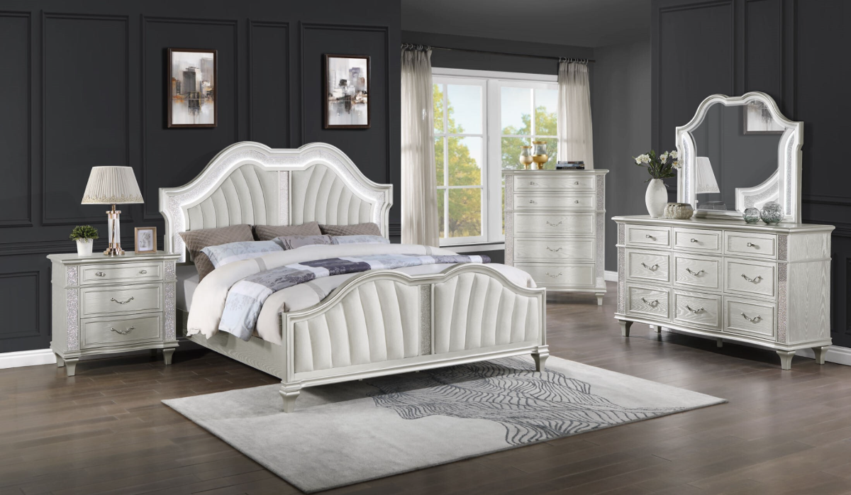 The Audrei Bedroom set embodies elegance and timeless charm, featuring a beautifully crafted bed with an arched headboard and intricate detailing. The silver finish adds a touch of sophistication, while the upholstered panels bring an element of softness and comfort. The matching dresser, mirror, and nightstand, offer ample storage space with refined drawer pulls and elegant moldings. This set seamlessly blends classic design with a contemporary aesthetic, making it a luxurious centerpiece for any bedroom.Read More