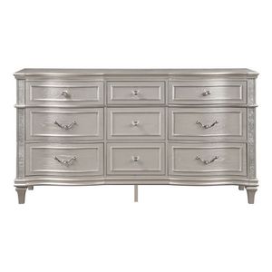 A silver finish creates an elegant touch to this glam Audrei Dresser by Coaster Furniture. Hexagon-shaped knobs and drop bail handles appointed with pearl accents adorn each of the nine spacious drawers for a luxurious look and feel. Keep delicate essentials organized within the grey felt-lined top drawers and garments in the deep bottom drawers. Across the dresser front is a curved facade that sweeps through the drawer fronts and ends at two sparkling column panels. The molding details along the top and bottom, along with intricate trim, offer a classical flair.Read More