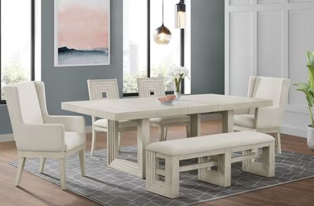 Introducing the Avalanche 6-Pc Dining Set, where elegance meets practicality. Set Includes Table, 2 Arm Chairs, 2 Side Chairs & Bench. Featuring an 18" leaf, extending from 74" to 92", it accommodates gatherings of any size with ease. Adorned with raised geometric patterns and finished in antique white, this set exudes modern sophistication.Read More