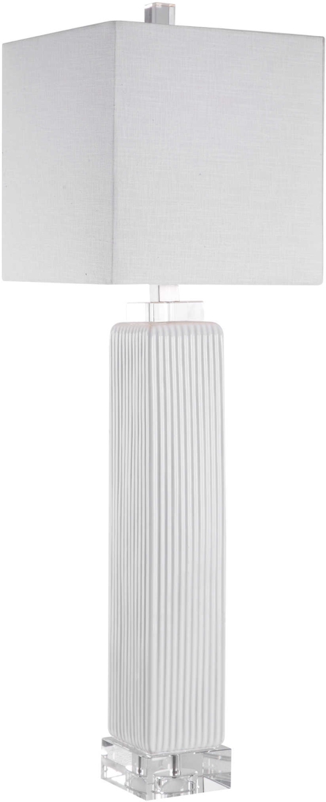 Showcasing a refined transitional style, this buffet lamp can be easily placed with its square ribbed base finished in a gloss white glaze, paired with thick crystal details and brushed nickel accents.