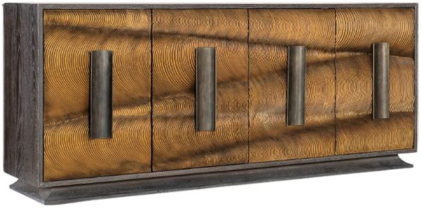 With an earthy and exotic elegance, the Mélange Swaley credenza is a striking silhouette with a dramatic gold swirl motif on the front, accented by dramatic curved vertical rectangle-shaped bronze hardware. Crafted of oak veneers and resin, has 2 adjustable shelves behind each pair of doors, a ventilated back panel with wire management, and a power supply.Read More