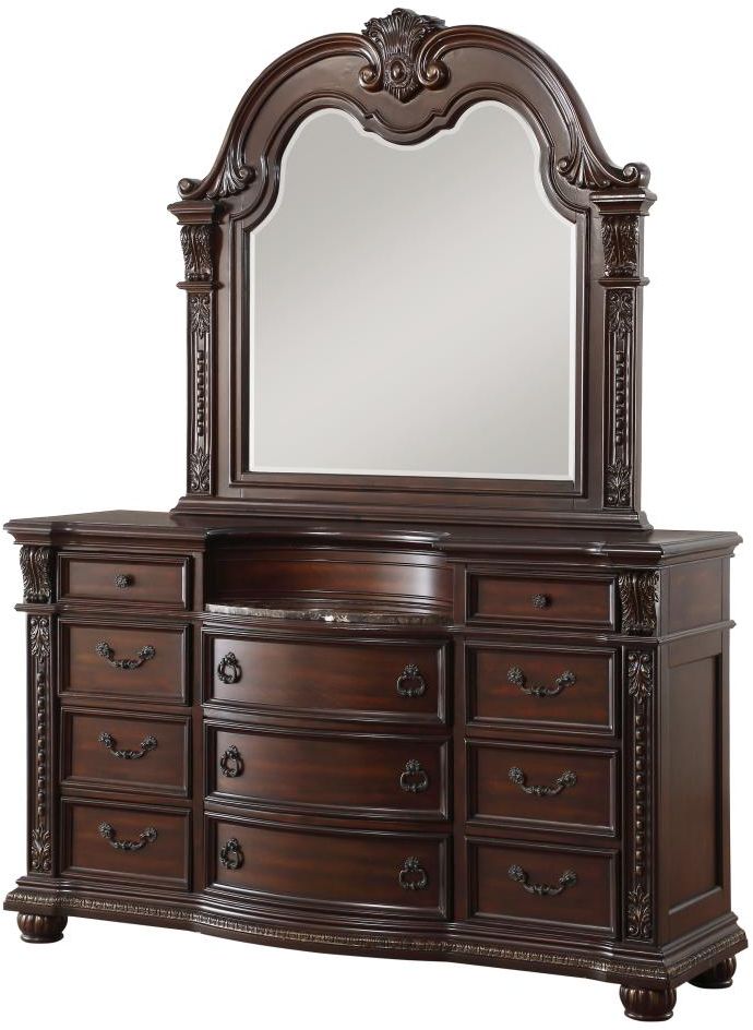 The Cavalier Collection exemplifies the finest in Old World European design inspiration. Egg and dart base moldings, bead molding, and acanthus leaf carvings all blend to achieve an elegant addition for your traditional home. The beautiful detail is accented by the dark cherry finish on birch veneers with gold highlights.