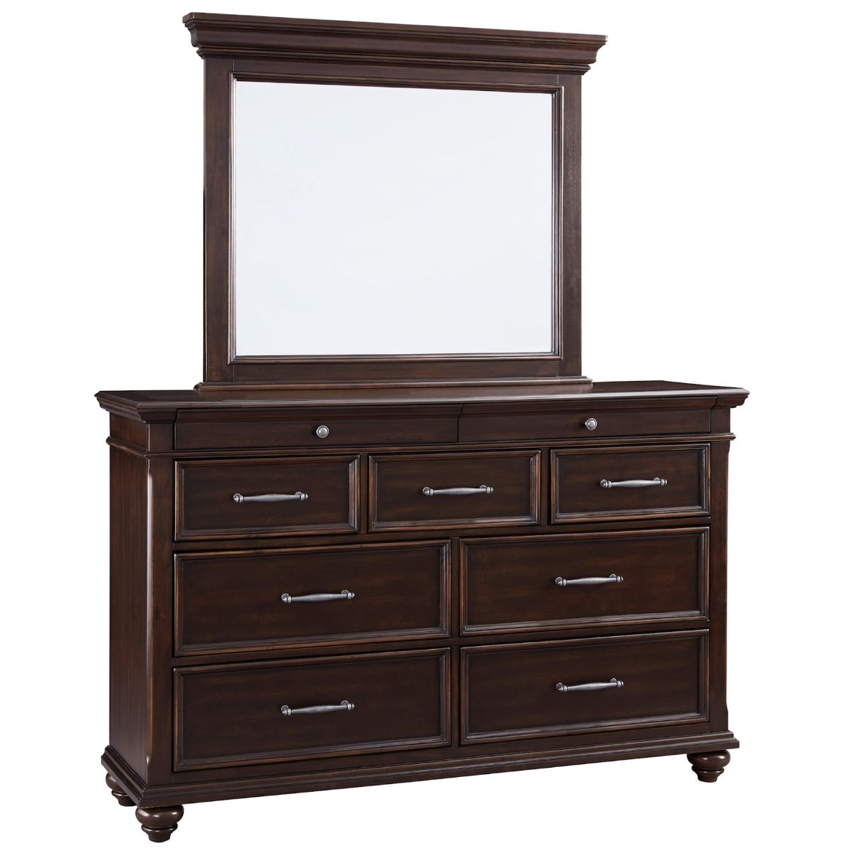 Who says you can’t have it all? The Chateaux King Panel Bed is everything you ever wanted in a bedroom centerpiece. Generously scaled proportions and a rich walnut-tone finish with hand-rubbed highlights radiate a sense of warmth and elegance. Seven drawers and two accessory drawers beautifully accommodate your wardrobe while a broad landscape glass catches all your best looks. Whether you're after the laid back look or high style, the clean-lined design of this duo ensures it's an easy addition to your bedroom's motif.Read More