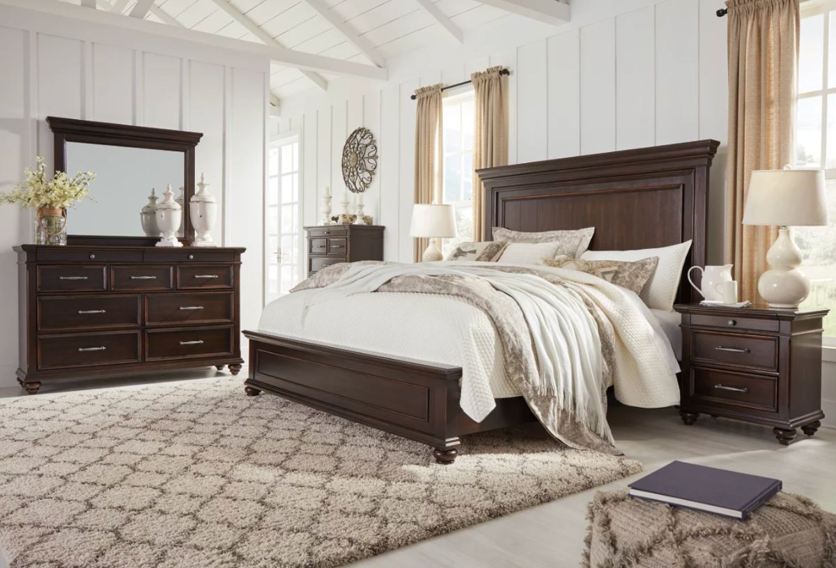 Set includes king bed, dresser, mirror, and nightstand