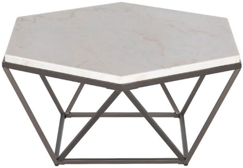 A beautiful white marble top combines with a coffee powder-coated metal base to create a group that is both light and substantial. But it is the shape of the tables that really steal the show with a hexagonal top and architectural base that will look great in any of today’s interior decors.Read More