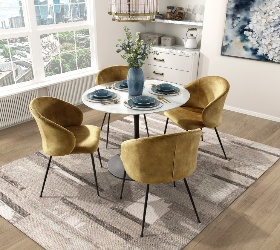 The Cosimo Collection blends classic charm with modern style, featuring a black metal tulip base supporting a marble-print tempered glass tabletop in a sleek white hue. Complementing the table, the side chairs are upholstered in Mustard velvet with black metal legs, adding a touch of elegance to your dining room décor.Read More