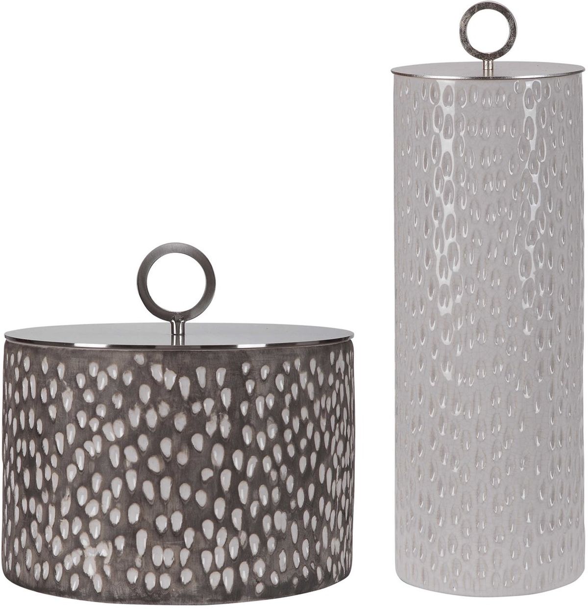 Ceramic Containers Feature Carved Detailing And Are Finished In Off-white And Smoke Gray Crackle Glazes With Respective Aged Gold And Brushed Nickel Finished Lids. Sizes: S-9x9x9, L-6x19x6Read More