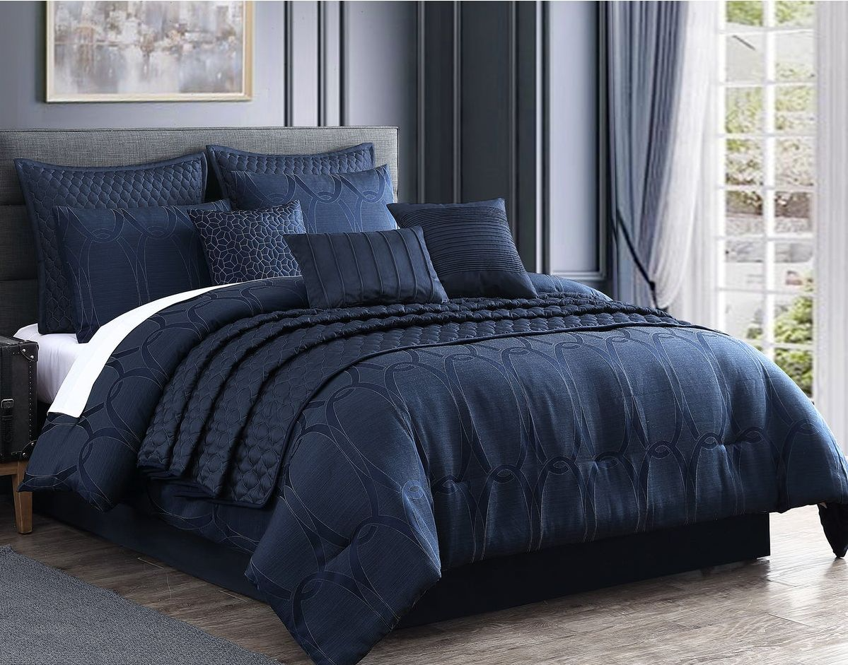 Includes: Comforter, 2 shams, 2 Euro shams, coverlet, 3 decorative pillows, and bedskirt