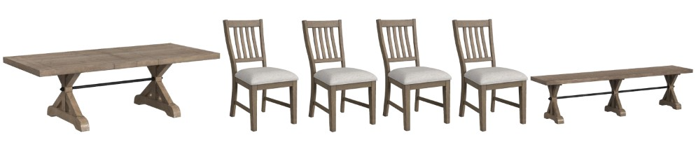 Includes table, four (4) side chairs, and dining bench