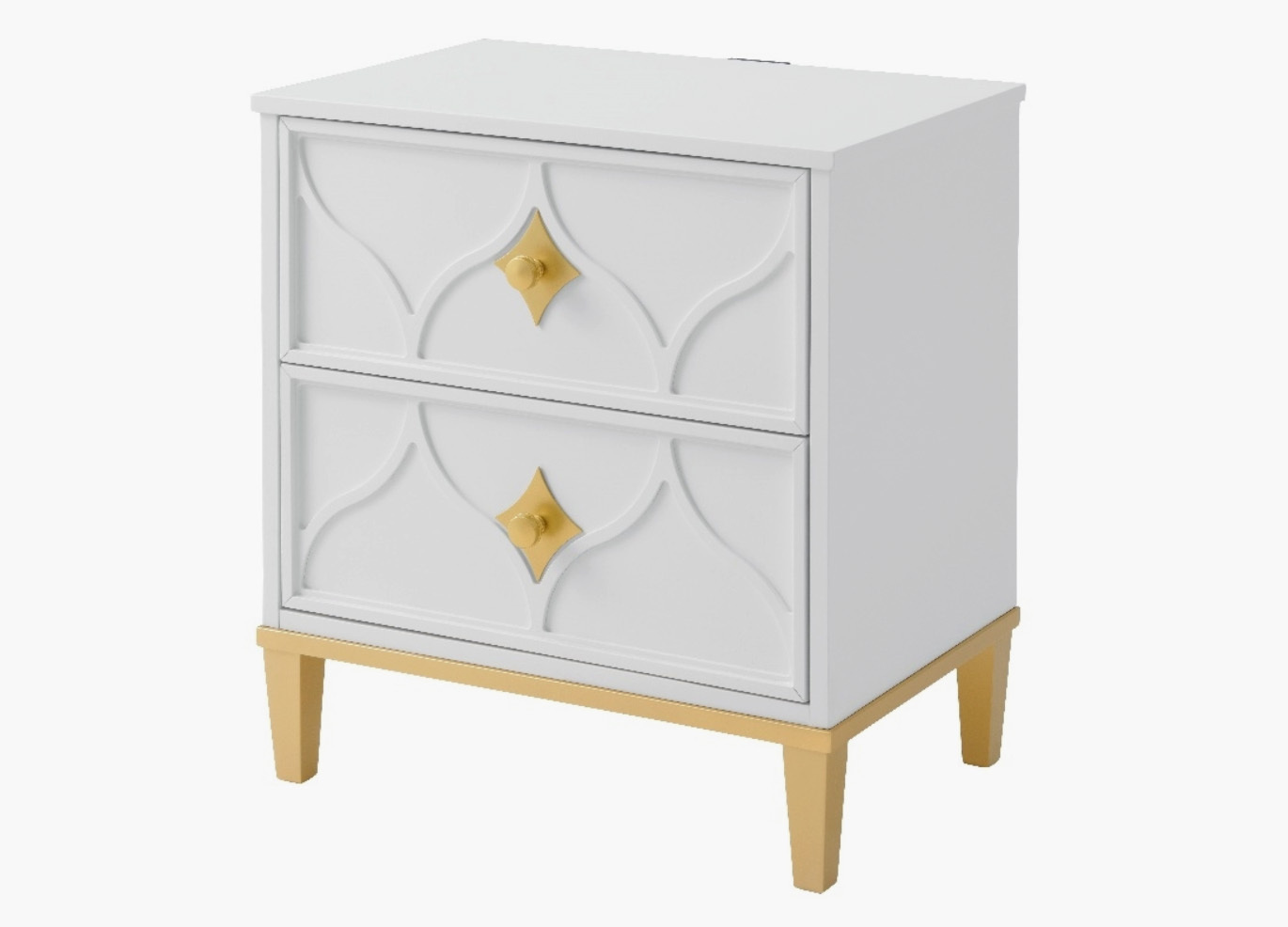 Effortlessly elegant and sweetly chic, the Emma White 2-Drawer Nightstand is designed to delight. A bright white finish, golden accents, and a lacy latticework pattern come together to bring timeless charm to any girl's dream bedroom. All this is paired with bedside convenience for storage and charging devices with a handy USB port.Read More