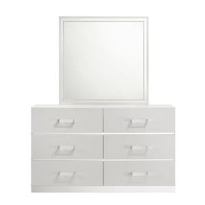The New Classic® Home Furnishings Europa White Dresser and Mirror combines modern elegance with timeless appeal. Its clean white finish and sleek design create a bright, stylish focal point for any bedroom. Made from eco-friendly manufactured woods, it is assembled with durability in mind, and the surfaces are finished with a glossy white topcoat. The upscale design includes a low-distortion mirror encased in a tapered frame, adding a modern flair to any room. With ample storage and a sophisticated look, it seamlessly enhances your space with a touch of contemporary elegance and high-quality construction.Read More