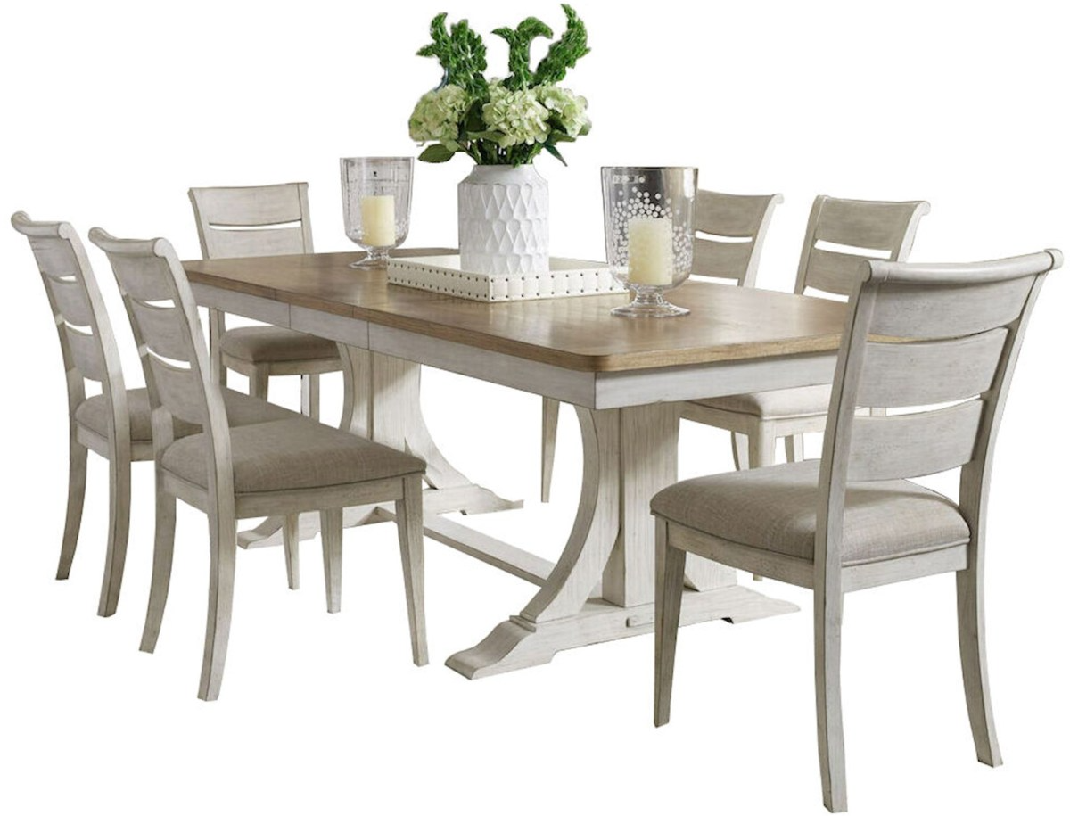 Wow family and friends with the Farmhouse Reimagined optional seven-piece trestle table set. Crafted of pine and poplar solids with hickory and pine veneers, this set features an antique white finish with heavy wire brush distressing and a chestnut top and consists of the trestle table and six ladder back upholstered side chairs.Read More