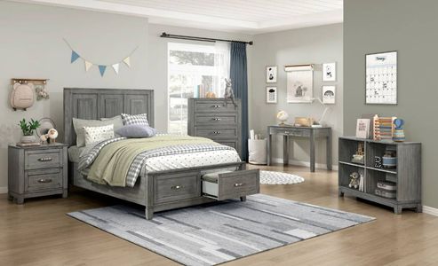 The Garretson 4-Pc Full Bedroom Set blends transitional lines with rustic styling to create a chic array for the master bedroom. Distinct wood grain stands out in a thunder gray finish while the metal bar hardware fronts the storage drawers for a magnetizing visual. Trim lines and deep dimensions offer a maximum of storage space without cramping the bedroom real estate.Read More