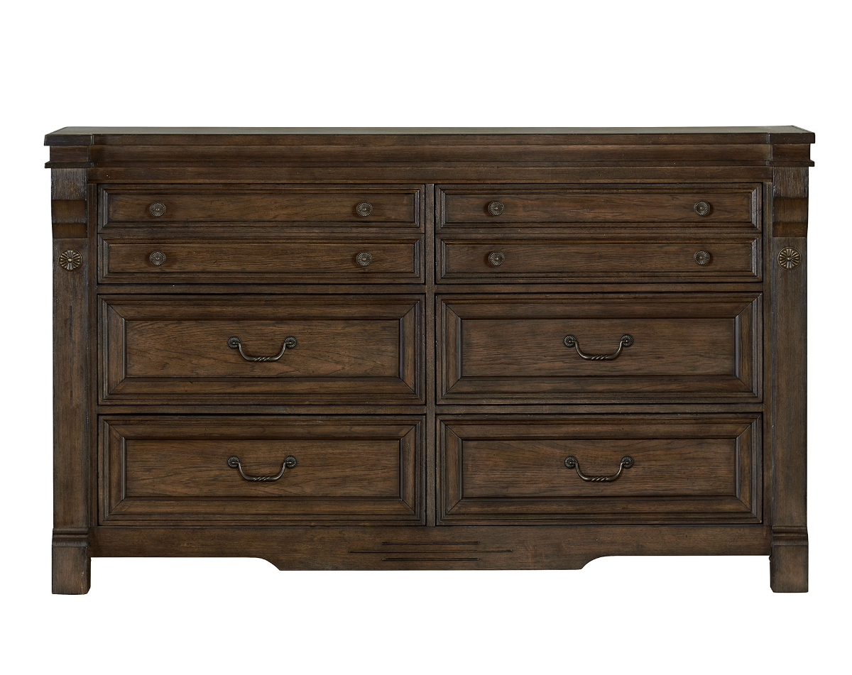 The Grand Teton Dresser from the Avalon Furniture Grand Teton Collection in rubber wood solids and pecan venners in a warm brown oak finish. English dovetail drawers mounted on 45 mm ball bearing glides with felt lined top drawers and cedar lined bottom drawers. Dresser has a coin tray and sliding jewelry tray.Read More