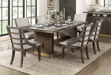 Curating a space that reflects your love for modern lines and desire for a sophisticated aesthetic becomes reality with the Griffin Collection. A brown finish highlights the oak veneer pattern, its rich hue complemented by the gold finish metal banding that graces the table top, pedestals, and chair's legs.Read More
