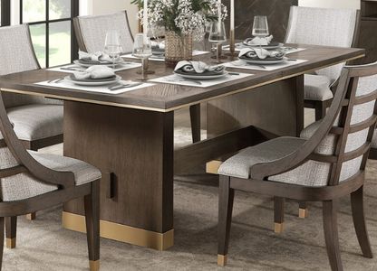 Curating a space that reflects your love for modern lines and desire for a sophisticated aesthetic becomes reality with the Griffin Collection. A brown finish highlights the oak veneer pattern, its rich hue complemented by the gold finish metal banding that graces the table top and pedestals.Read More