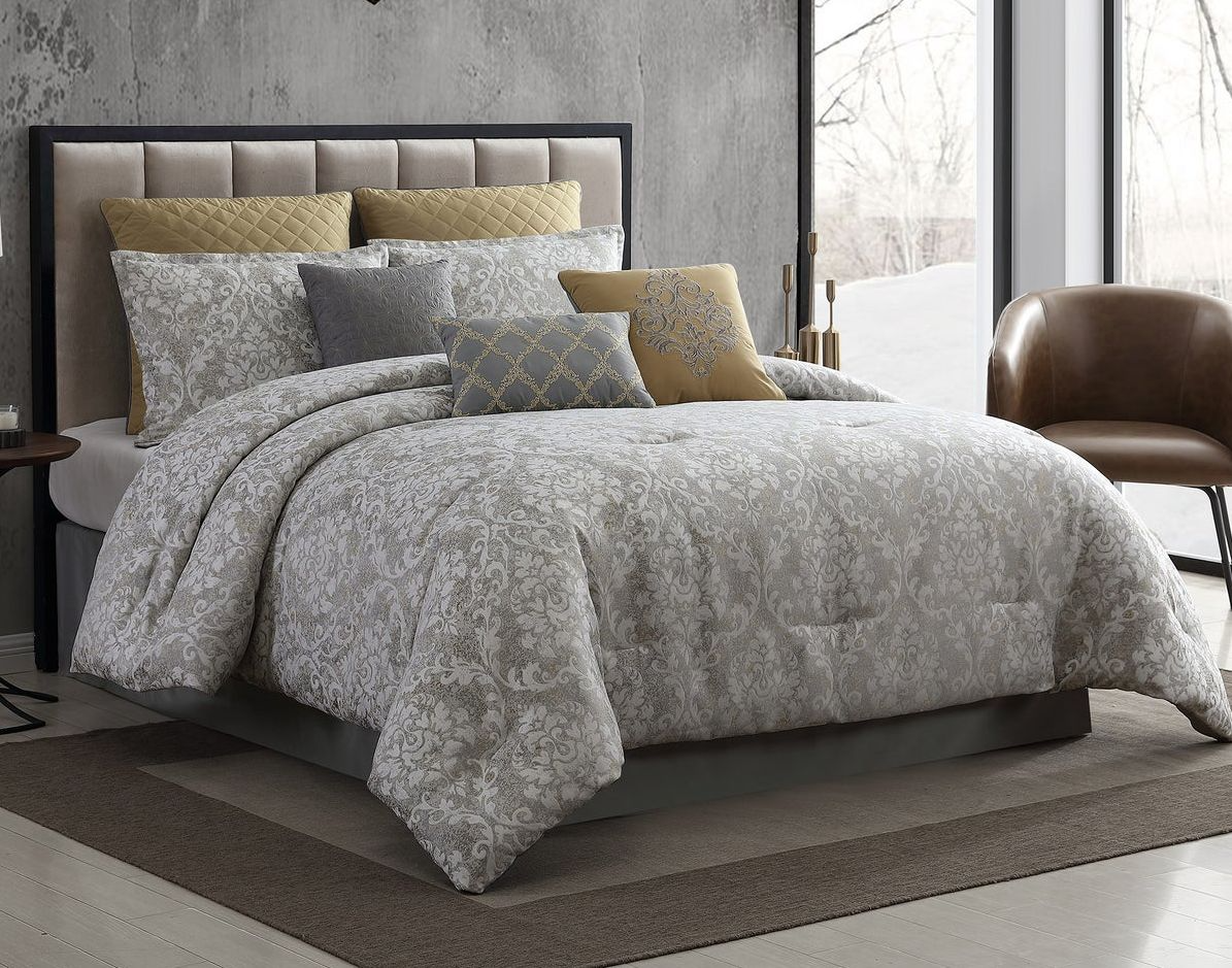 The Hallmart Collectibles Lisbon 9-Piece Queen Comforter Set features a combination of quilting, damask patterns, and warm gold tones sure to add a touch of style to your space. This sophisticated set will brighten even the plainest of guest bedrooms.Read More