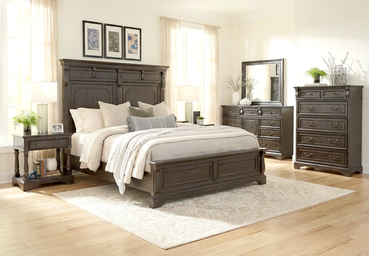 The Hickory Creek bedroom features a timeless silhouette with detailed molding that adds depth and architectural character. The rich brown velvet wood finish enhances its traditional appeal while showcasing the natural beauty and grain of split heart cathedral hickory veneers.Read More