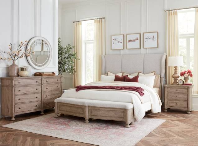 Elevate your space into a haven of elegance and serenity with our Higgins Street queen upholstered bedroom set. The headboard features a timeless silhouette with a classic wing design that extends gracefully on either side. The case pieces blend classic charm with modern simplicity, striking a perfect balance between classic and contemporary styles. Featuring antique pewter hardware, the drawers provide ample storage for clothing, linens, and all your bedroom essentials.Read More