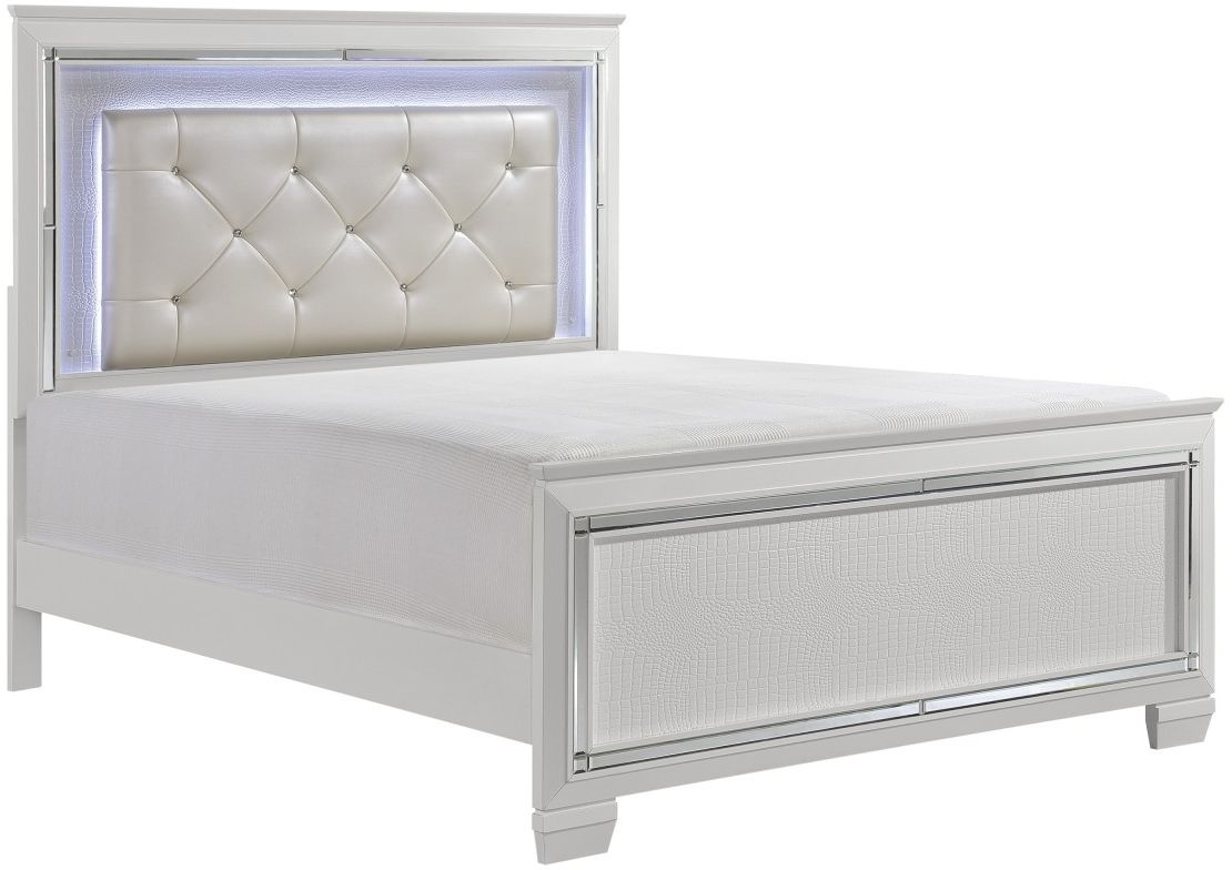 Glamour reigns in the design of the Allura Collection. Framing the Full bed is a decorative beveled mirror accent that enhances the illumination from the touch-engaged LED backlight of the headboard. Alligator embossing and high polished crystal-enhanced hardware boldly accent the white finish as does the pearl-white faux leather crystal-tufted headboard insert.Read More