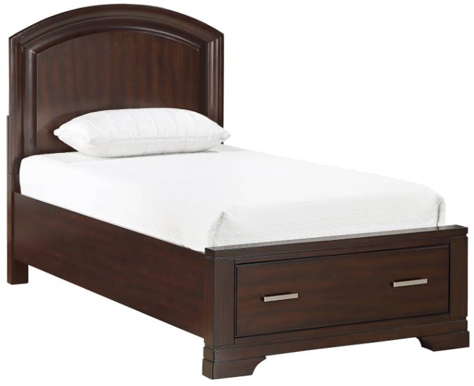 The intersection of modern lines and understated transitional style blend to create the Hudson Collection.The cherry finish over birch veneer of the twin bed presents a decoratively versatile addition to your bedroom. Polished chrome bar hardware fronts the storage drawer of the bed’s footboard. The curved design of the bed’s headboard lends subtle decorative shape to the collection.Read More