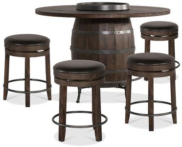 The Sunny Designs™ Tobacco leaf round pub table features a distinctive wine barrel base and rich tobacco leaf finish. Its sturdy construction and rustic charm make it ideal for entertaining, offering a unique centerpiece for casual gatherings or cozy dining spaces.