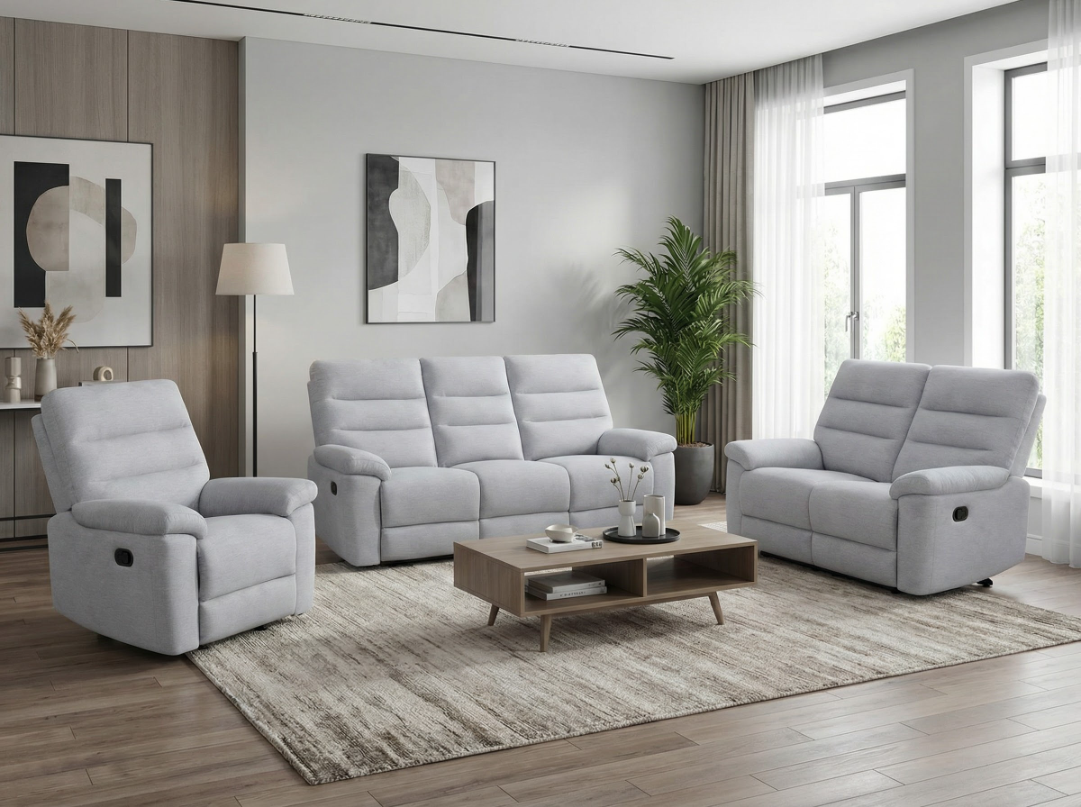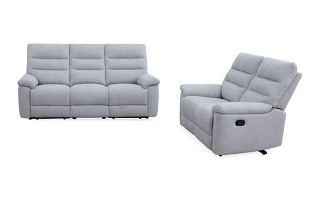 Includes dual reclining sofa & dual reclining loveseat in a dove gray fabric cover.Read More