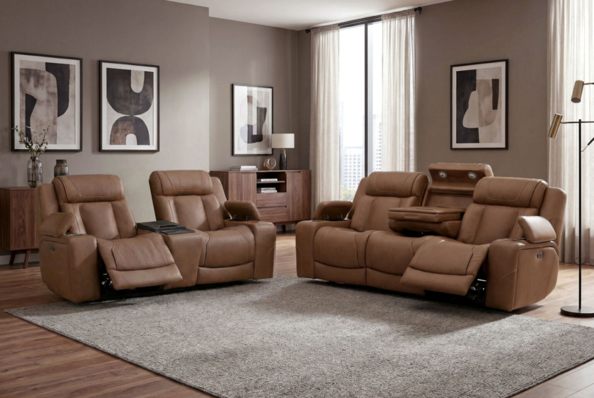 Updated comfort and relaxing style. Make the Jancie Dual Power Reclining Sofa and Loveseat a standout staple for any living room. Loveseat includes a built-in mini-fridge with 2 hidden cup holders and a wireless charging pad.Read More