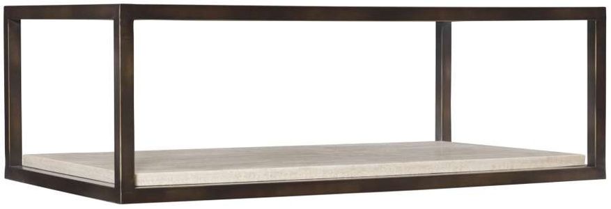 Bernhardt Occasional offers a wide range of upscale designs for luxe living spaces. The Kinsley cocktail table makes a bold statement with a streamlined rectangular frame constructed of bronze-finished tubular steel. The white travertine bottom shelf perfectly complements the bronze tempered glass top for a dimensional and balanced effect.Read More