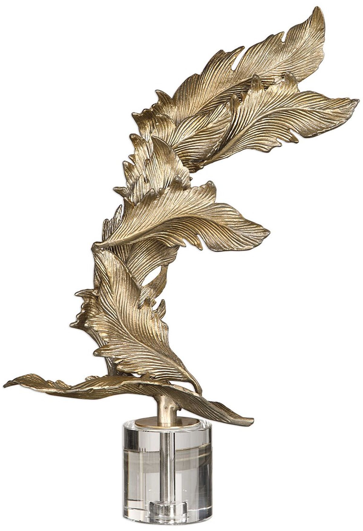 Inspired by falling, fall leaves this sculpture features cast aluminum leaves finished in an antiqued silver champagne finish displayed on a crystal cylinder base.