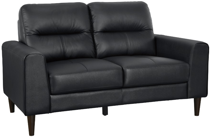 Modern comfort is paired with retro lines to create the design of the Lewes Collection. Covering the love seat is black 100% top grain leather where the body touches, while all other areas feature faux leather. Track arms and contoured seating lend to the versatile modern look.Read More