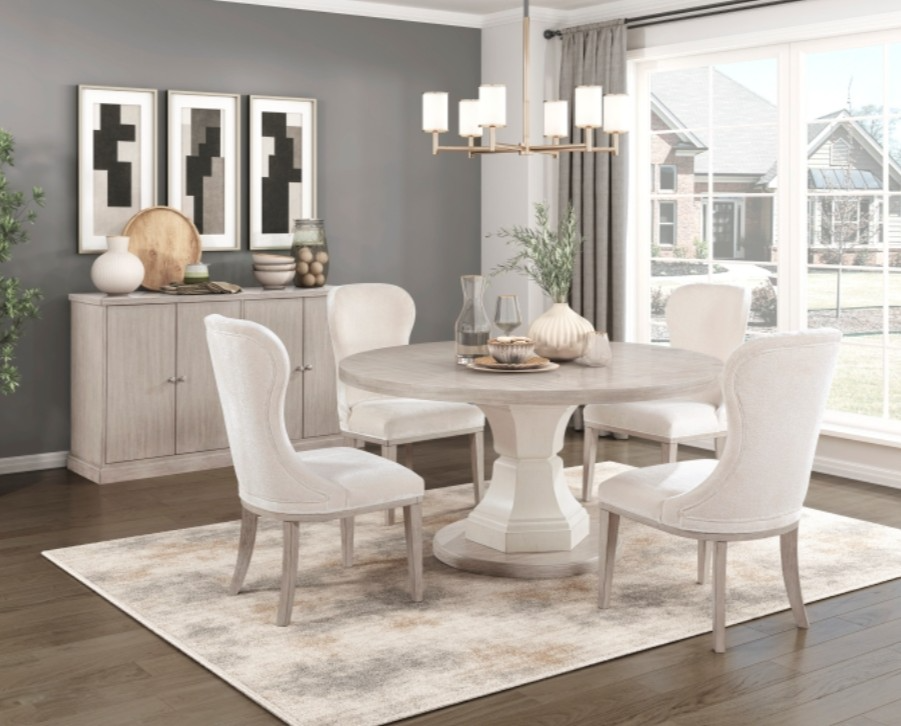 The Lofton 5-Piece Dining Set brings timeless sophistication and casual elegance to your dining room. Featuring a round pedestal table with a light, weathered finish and 4 upholstered chairs this set blends classic design with modern comfort. The high-back chairs are tailored in a soft neutral fabric that complements the table’s refined wood tones, creating a bright, inviting space perfect for family dinners or entertaining guests.Read More