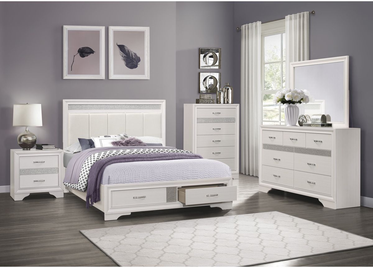 The unique styling of the Luster Collection presents a glamorous option for your bedroom. 3D printed paper veneer features a white finish that allows for the acrylic silver glitter fronts of the hidden jewelry drawers to shine. The jewelry drawers feature felt lining to protect your hidden items from wear and tear. The panel headboard features acrylic silver glitter accent banding as well as a silver bi-cast vinyl channel-padded insert. Polished chrome bar drawer pulls adds a stunning finish.Read More