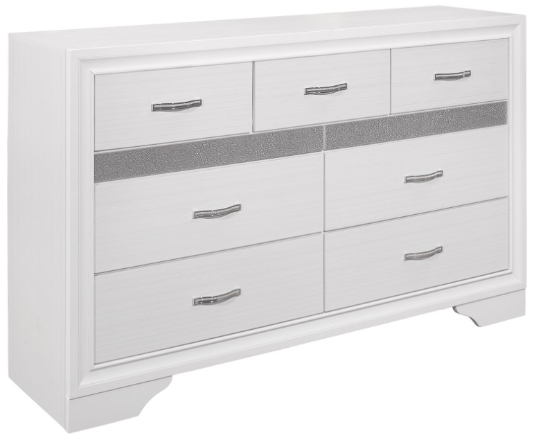 The unique styling of the Luster collection presents a glamorous option for your bedroom. The dresser’s embossed faux-wood veneer features a white finish that allows for the acrylic silver glitter front of the hidden jewelry drawer to shine.Read More