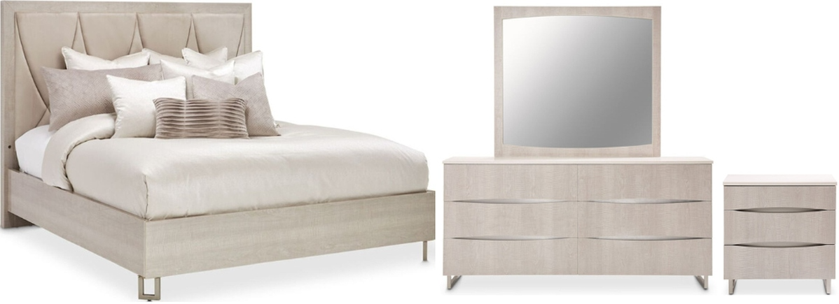 Complete your luxury style with the Marin collection. Set includes queen bed, dresser, mirror, and nightstand.