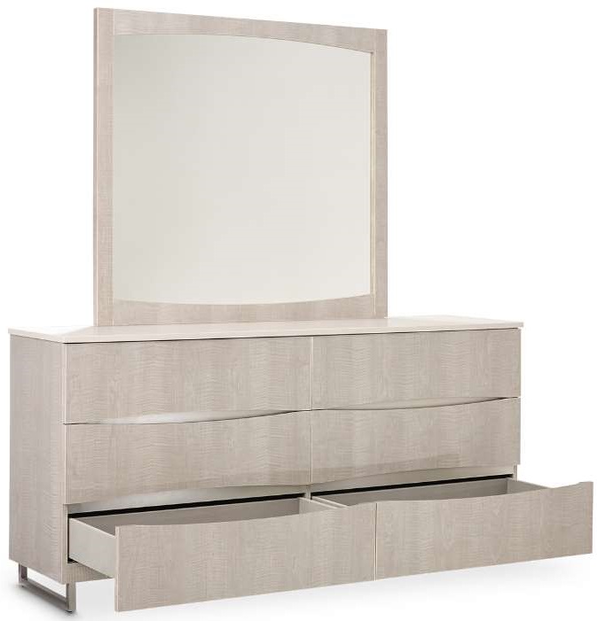 Generouly scaled with 6 velvet lined drawers, the Marin dresser is adorned with contrasting cultured marble top, stainless accents on case front, and stainless-steel feet. The self-closing glides offer ease of function.Read More
