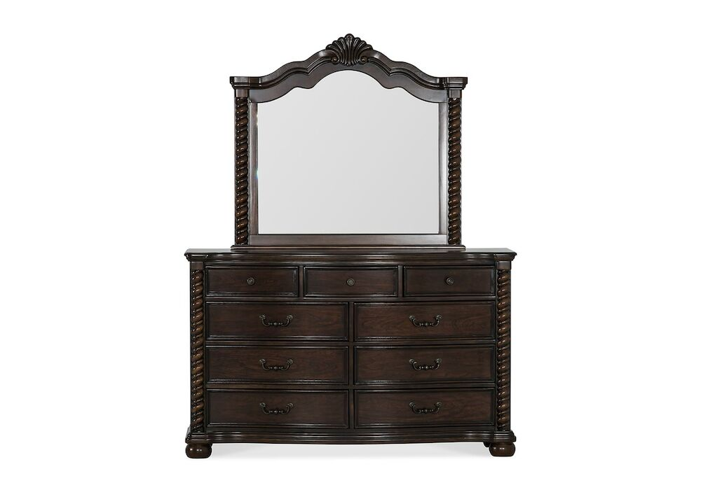 Dripping with traditional grandeur, the Montarosa 2-Pc Dresser and Mirror is a gem of classic design. Nine spacious drawers come framed in dark cherry finishes, twining rope detail, bun feet, antique knob and handle hardware, and enduring elegance. All this comes with a gleaming beveled glass in an intricate frame.Read More