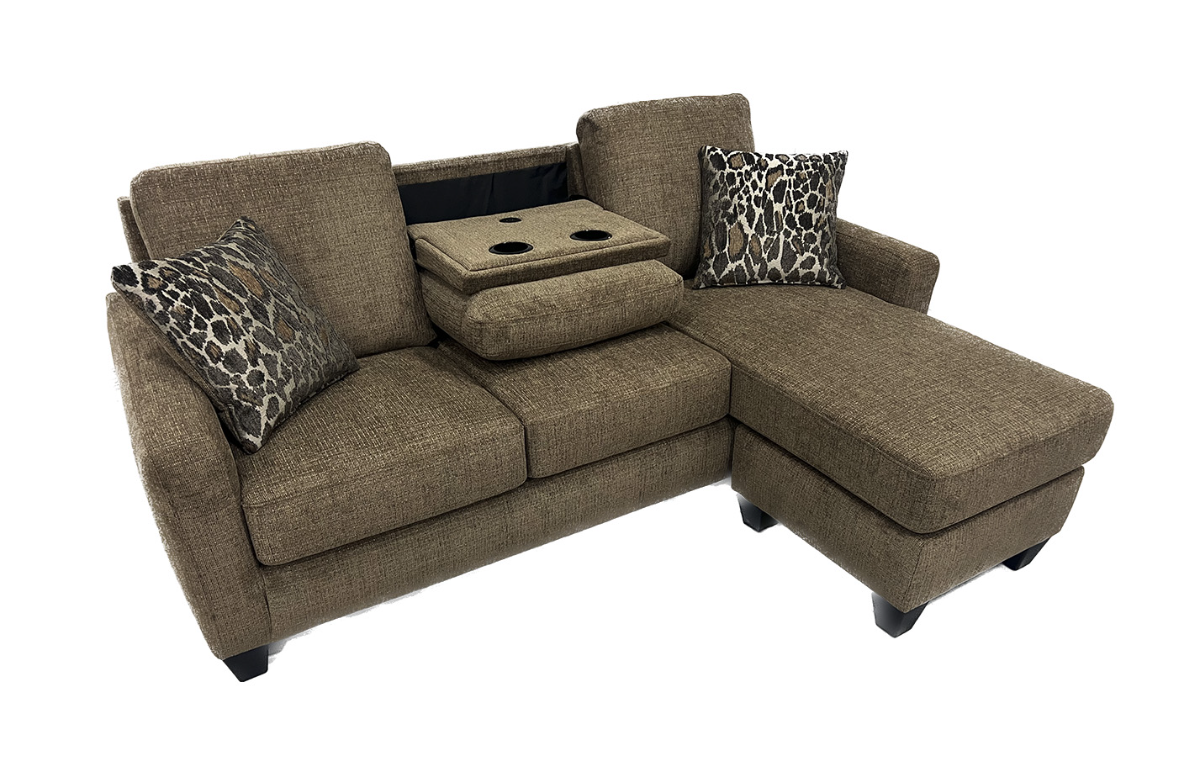 Made with 21st century flair and versatility, the Noble Reversible Sofa Chaise is here to accommodate the updated living room. Available in your choice of a tan or cocoa palette, this au courant gem has more than class and comfort in its design. Sporting a chic L-shaped profile, the midsection of the sofa back can be dropped down to use as a convenient tray and dual cupholder, guaranteeing a theater-worthy experience for every game and movie night. Accent pillows with a pop of animal pelt patterning complete the lookRead More