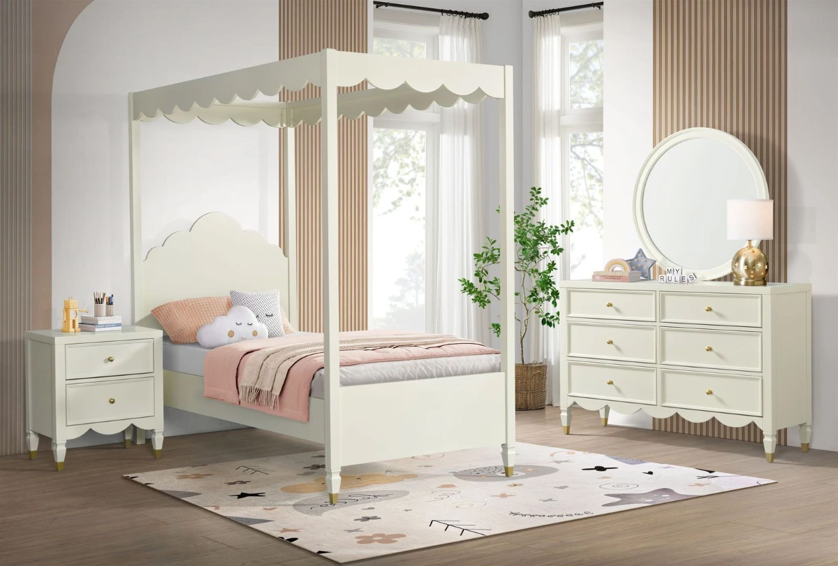The Olivia Canopy Bed features graceful scalloped edges, tapered legs, and a soft ivory finish that adds warmth and character. Its airy canopy frame creates a magical focal point while the classic design ensures timeless style for children and teens.