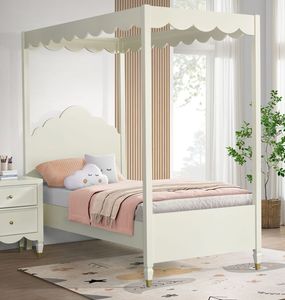 The Olivia Canopy Bed features graceful scalloped edges, tapered legs, and a soft ivory finish that adds warmth and character. Its airy canopy frame creates a magical focal point while the classic design ensures timeless style for children and teens.Read More