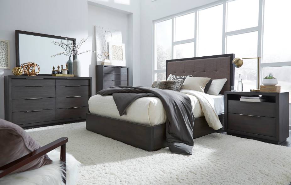The sleekly tailored Oxford collection makes a striking first impression with bold proportions, crisp, modern lines and a weathered finish. Smartly accented with top-mounted nickel plated pulls, concealed footboard storage, and a floating plinth base.
