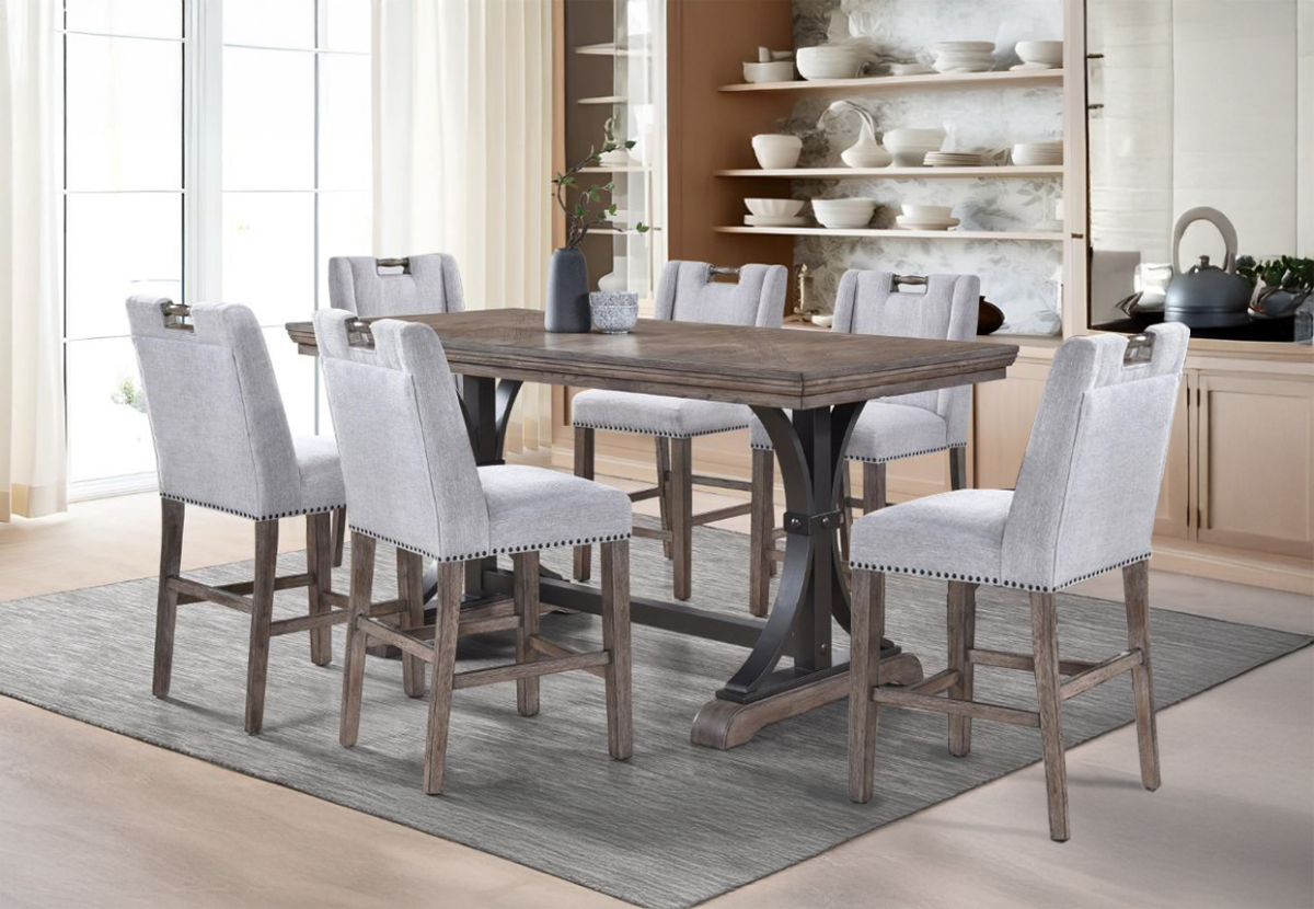 The Portland counter height dining set showcases a rectangular trestle table made from solid wood, designed with a strong, heirloom-style base. The natural finish brings out the wood’s organic grain, adding rustic warmth, for a timeless, welcoming feel. Combining rugged strength with understated elegance, this counter height table perfectly merges farmhouse appeal with practicality, ideal for intimate meals and cozy gatherings.
