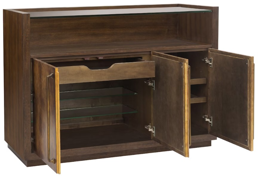 Enhance your entertainment area with the Pulaski™ Accents copper/dark brown bar. Featuring a luxurious copper and dark brown finish, three doors for ample storage, and a sleek glass top, this stylish piece adds sophistication and functionality to any room. Its elegant design and quality craftsmanship make it a standout addition.Read More