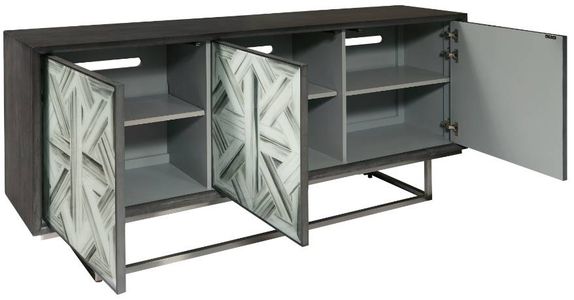 Introduce a fashion-forward element to your home with our hand painted 3-door credenza. This item offers adjustable/removable shelves behind each door, providing ample storage space for books, blankets, electronics, and more. An intricate, reverse hand-painted design flows across the surface of the glass door fronts, adding beauty and character to your living space.Read More