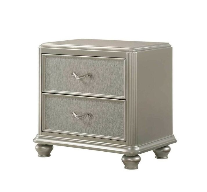 Redolent with modern glamour, the Regency Platinum 2-Drawer Nightstand is the jewel of any luxurious master bedroom. Finished in gleaming platinum, the dazzling curled pulls and spacious drawers' felt lining are bound to give you a divine bedside staple. Embrace the elegance you deserve with the Regency collection.Read More