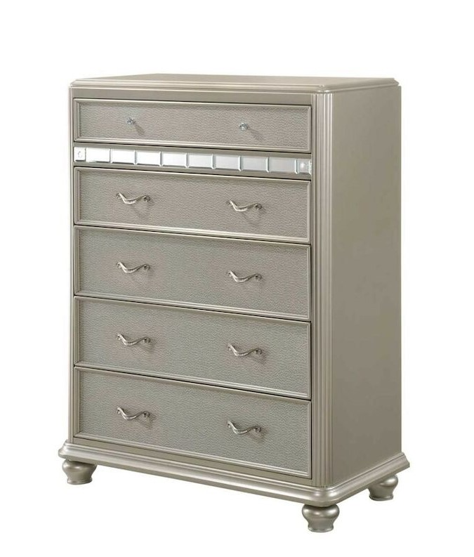 Redolent with modern glamour, the Regency Platinum 5-Drawer Chest is the jewel of any luxurious master bedroom. Finished in gleaming platinum, the dazzling curled pulls and spacious drawers' felt lining are bound to give you a divine bedside staple. Embrace the elegance you deserve with the Regency collection.Read More