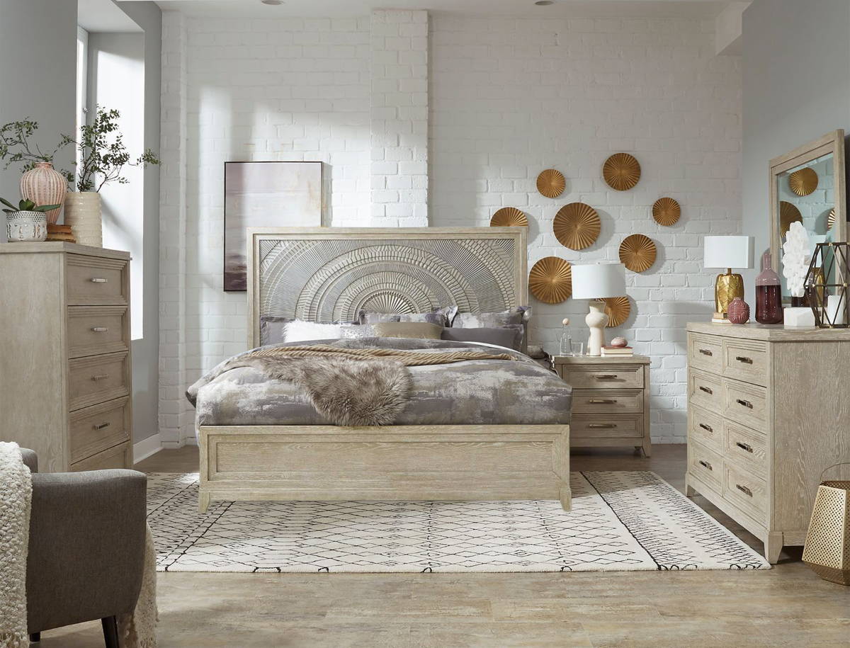 Make a statement with the Sasha Queen Panel bed. Crafted with rubberwood solids and split heart oak veneers, the washed taupe and silver champagne finish is accented by dusty gray wax that creates a unique look from piece to piece.