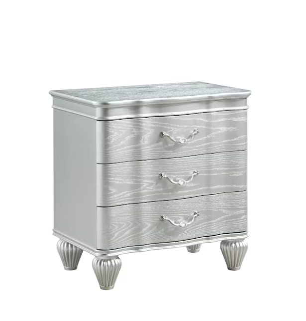 A perfect blend of traditional elegance and modern convenience, the Sophia 3-drawer nightstand is finished in a rich silver hue, bringing a sophisticated touch to your space. Its compact design features three spacious drawers equipped with sturdy metal drawer pulls, providing ample storage for your bedside essentials. The nightstand’s classic legs and timeless silhouette offer a distinctive charm, while its robust construction ensures lasting durability. This piece is designed to enhance both functionality and style, making it an ideal addition to any bedroom setting.Read More